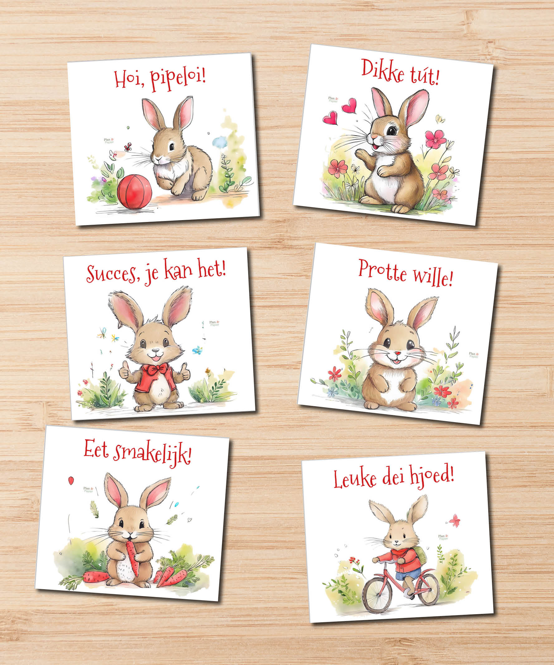 De schattige konijntjes en lieve teksten zoals “Veel plezier!”, “Succes, je kan het!” of “Dikke tút!” zorgen voor een warm en vrolijk moment in de schoolpauze. 🐰💌