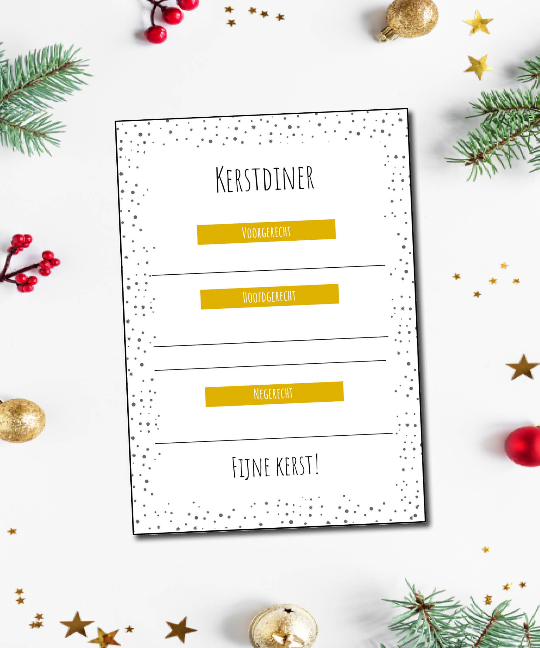 De menukaart biedt ruimte voor voorgerecht, hoofdgerecht en nagerecht, zodat je het volledige kerstmenu overzichtelijk kunt presenteren. Dankzij het tijdloze ontwerp past deze kerst menukaart bij vrijwel iedere kerststijl: van minimalistisch tot warm en gezellig.