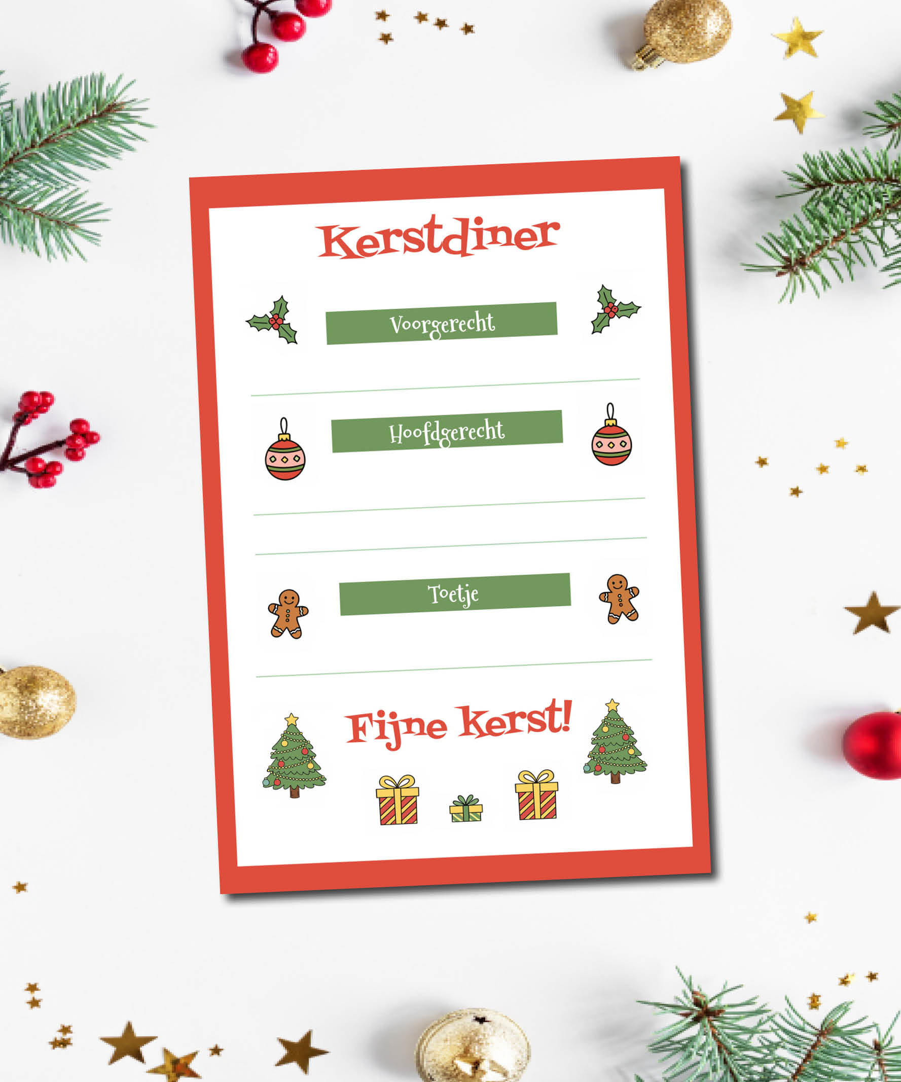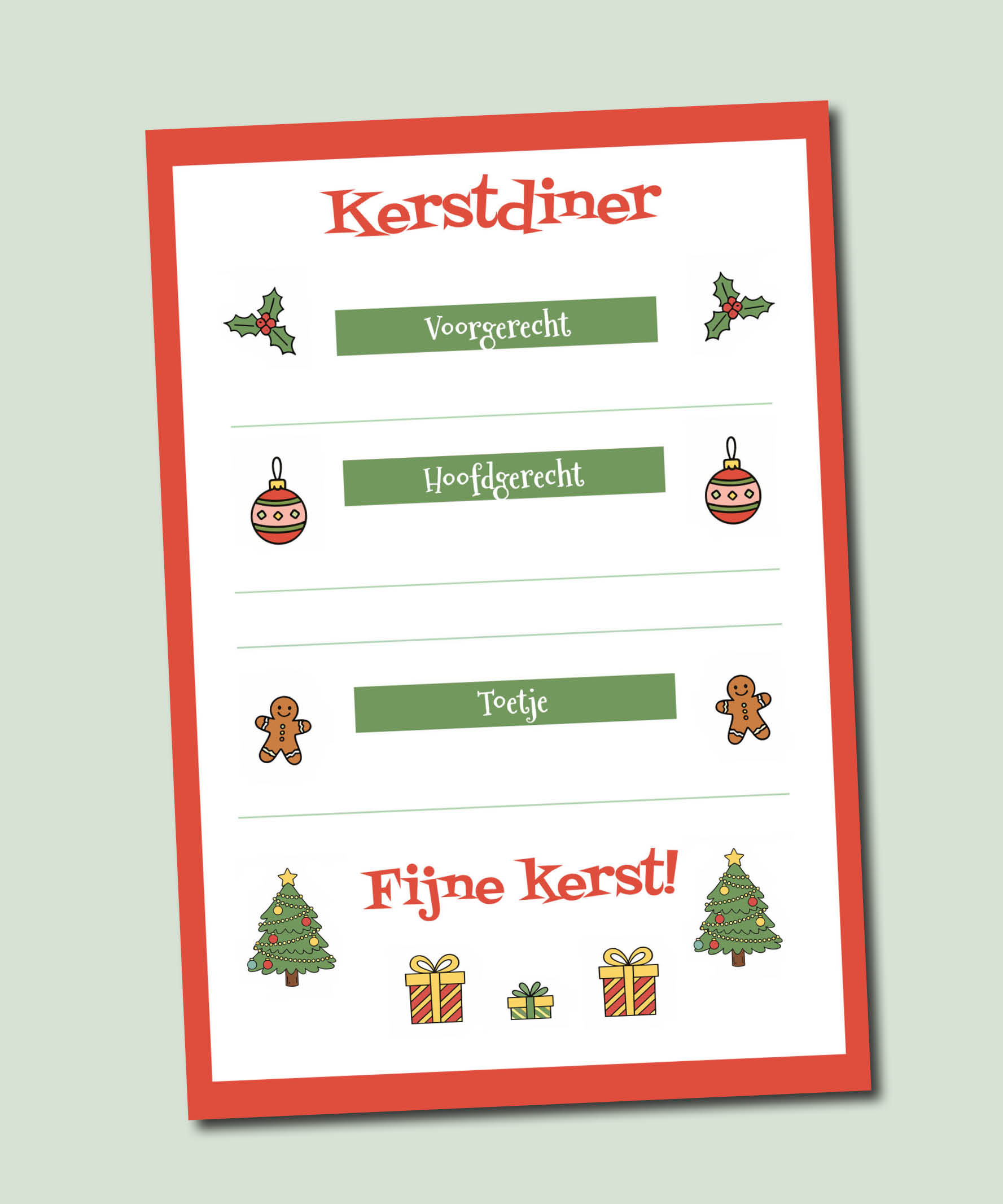 Maak het kerstdiner extra leuk voor kinderen met deze vrolijke kindermenukaart kerst printable. Speciaal ontworpen voor jonge eters, met herkenbare kerstillustraties zoals kerstballetjes, koekmannetjes en cadeautjes. Zo voelen kinderen zich écht onderdeel van het kerstdiner.