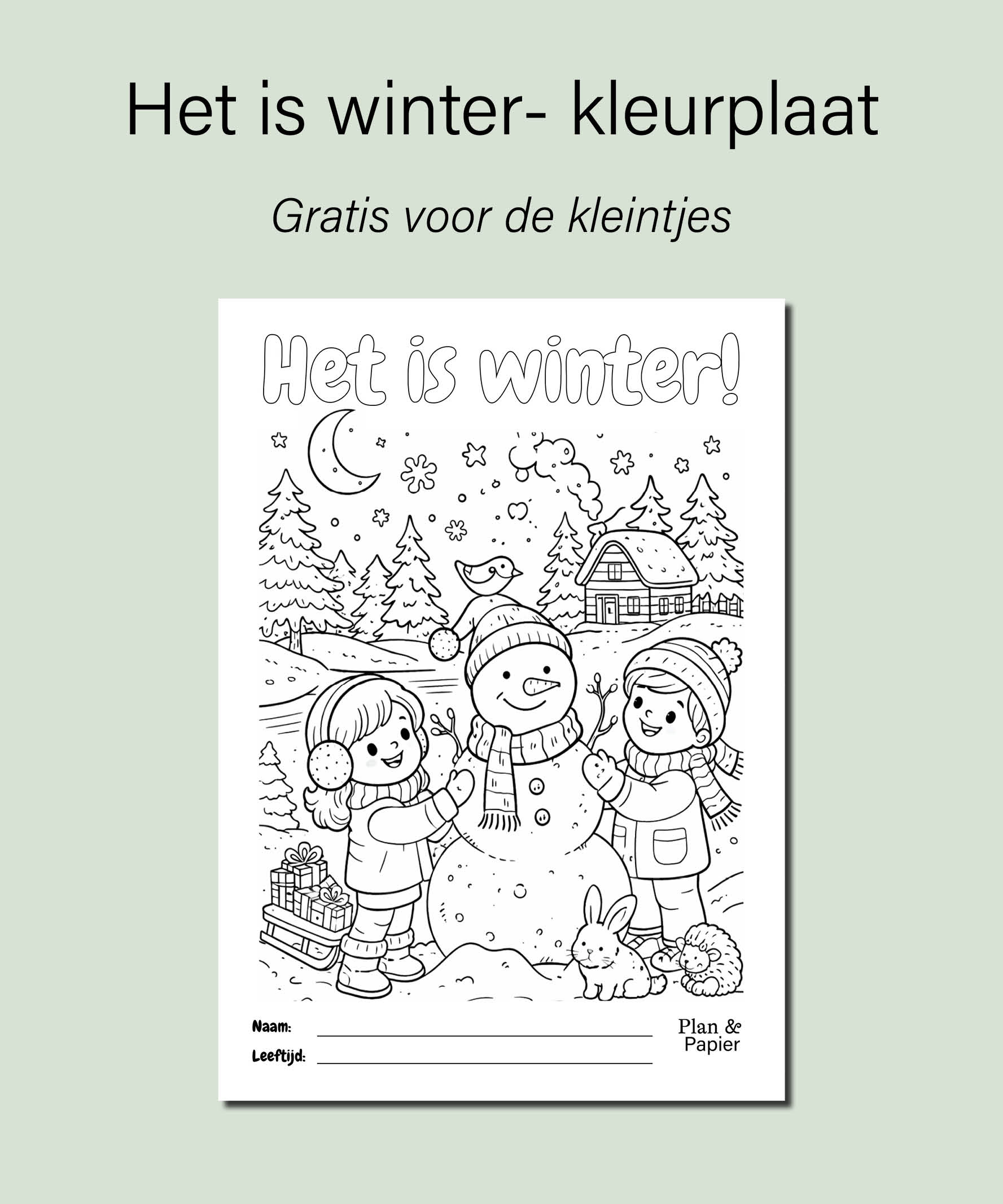 Deze winterse kleurplaat voor kinderen toont een sfeervol winterlandschap met sneeuwpop, kinderen en dieren. Dankzij de duidelijke lijnen is hij geschikt voor kinderen van ca. 4–7 jaar. Onderaan is ruimte voor naam en leeftijd.