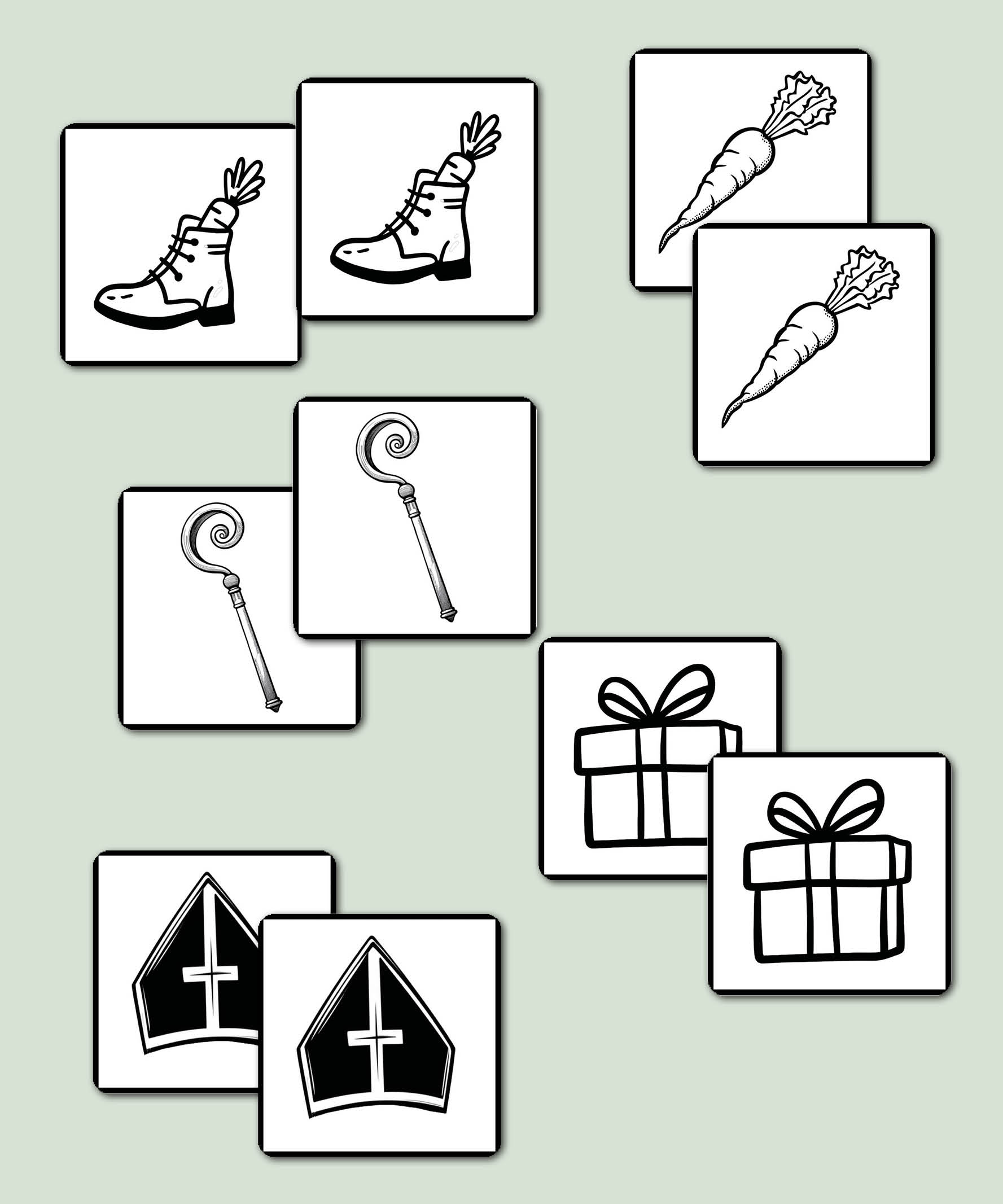 Maak Sinterklaas dit jaar extra gezellig met deze Sinterklaas memory! Op één pagina vind je 12 leuke kaartjes met herkenbare Sinterklaas-afbeeldingen zoals het paard, de mijter, cadeautjes en natuurlijk de wortel in de schoen. Print de kaartjes 2 maal uit, knip ze uit en speel samen memory aan tafel, in de klas of tijdens pakjesavond.
