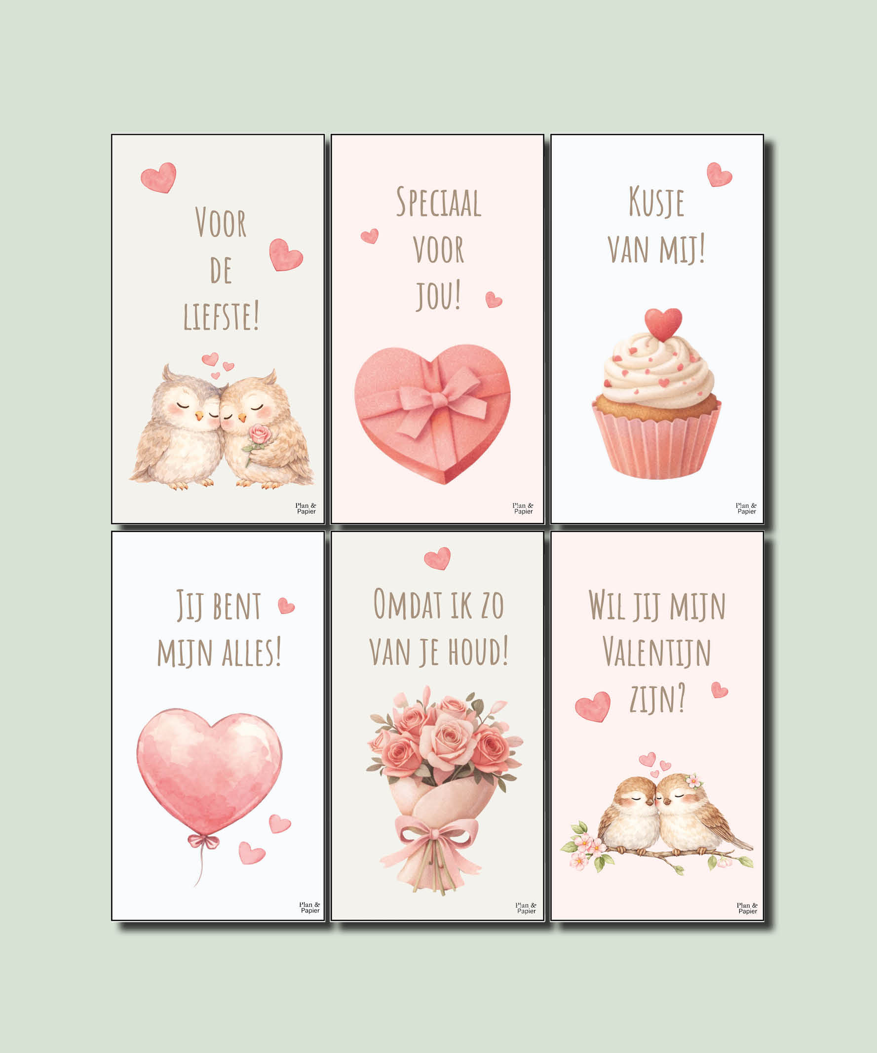 De Valentijnsdag kadokaartjes zijn ontworpen in rustige pastelkleuren en passen bij zowel grote als kleine cadeaus. Ze zijn ideaal om te gebruiken bij chocolade, bloemen, een cadeautje voor je partner, een verrassing voor je kind of een lief gebaar voor iemand die je dierbaar is. Ook voor school, traktaties of een brievenbuscadeautje zijn deze kaartjes heel geschikt.