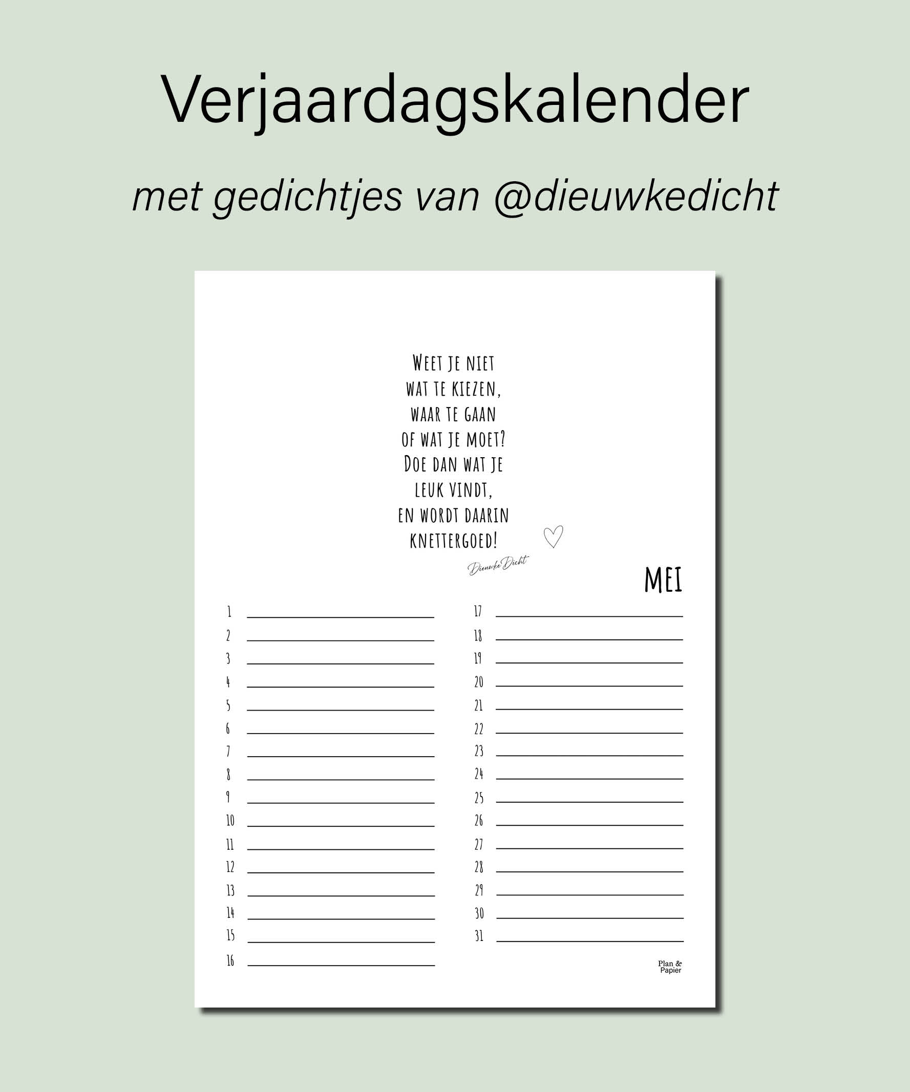 Deze kalender maakt van elke maand een klein moment van rust én herinnering. Hang hem in de keuken, hal, werkplek of planhoekje — en laat de woorden van @dieuwkedicht je door het jaar heen begeleiden.